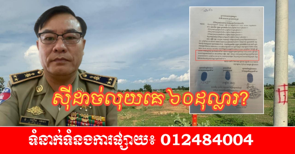(ភ្នំពេញ)៖ ពលរដ្ឋជាអ្នកលក់ដី កំពុងស្រែកដង្ហើយរកយុត្តិធម៌ ដោយអះអាងថា លោកឧត្តមសេនីយ៍ទោ អៀម រតនា អត្តលេខៈ ០៧៣៧៦ ប្រធាននាយកដ្ឋានអធិការកិច្ច កិច្ចការនគរបាលថ្នាក់កណ្តាល នៃអគ្គាធិការដ្ឋាន ក្រសួងមហាផ្ទៃ ស៊ីដាច់លុយចំនួន៦០ម៉ឺនដុល្លារ..!!។